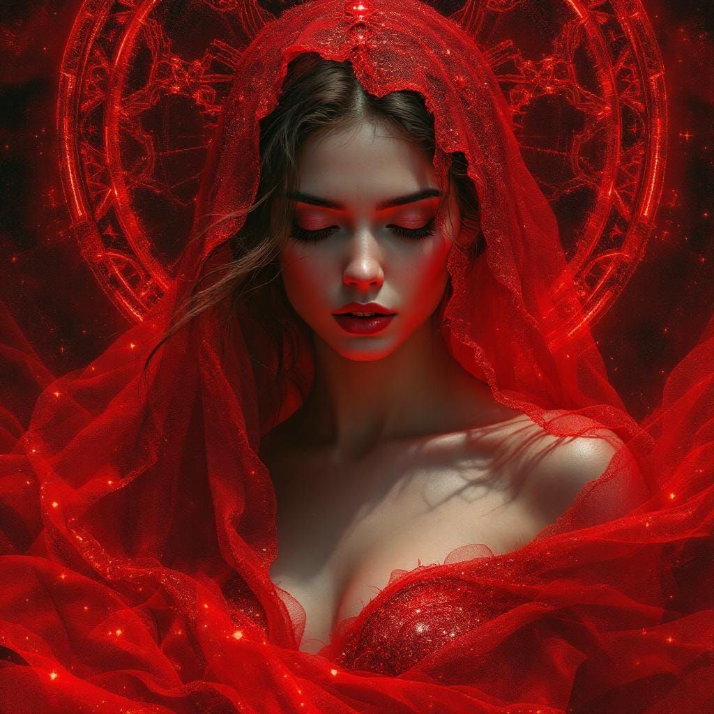 This image shows a beautiful goddess in flowing robes, gazing downward with a contemplative expression. The artwork is rendered in monochromatic reds, as a holographic astral cosmic illustration.