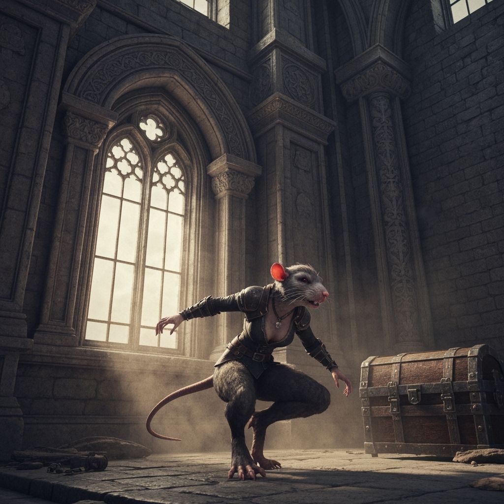 A dark fantasy image of a wererat assassin killing an adventurer in a castle. The scene features a medieval aesthetic with blood and gore, reminiscent of classic fantasy art styles.