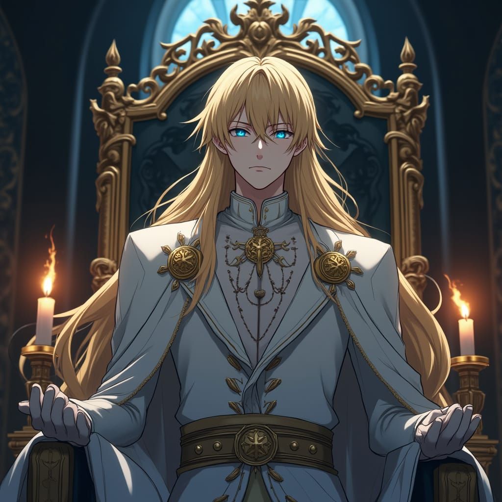 This image shows a handsome anime prince in a dimly lit throne room. He is clad in white clothing and arcane symbols glow, hinting at dark magic in this work of anime art.