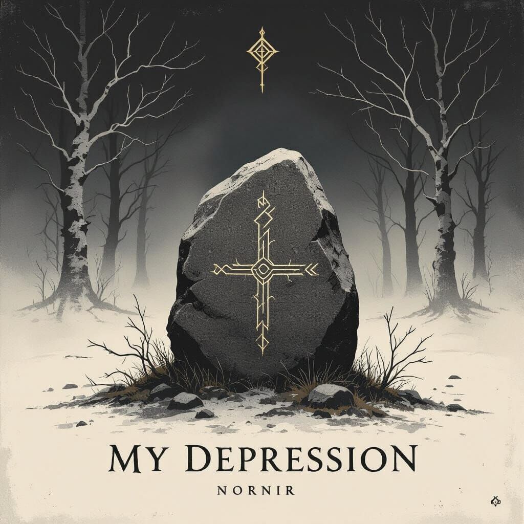 A striking picture of weathered stone featuring an ancient rune, set against a dark, misty Nordic forest. Muted earthy tones and stark contrasts create a timeless, ritualistic atmosphere in a minimalist, neofolk style.