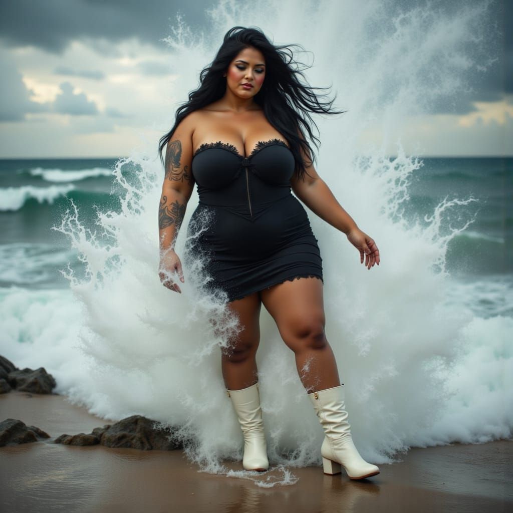 This image captures a stunning, plus-size woman standing heroically against a turbulent backdrop, evoking the styles of dramatic landscapes and intimate portraiture, with a cinematic, filmic quality and rich, vibrant colors.
