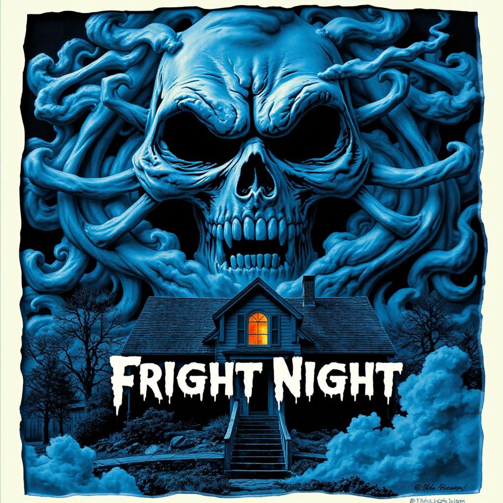This haunting image features a sunken relief face formed from swirling clouds, looming over a suburban house with eerie blue tones and ghostly details, creating a chilling atmosphere.