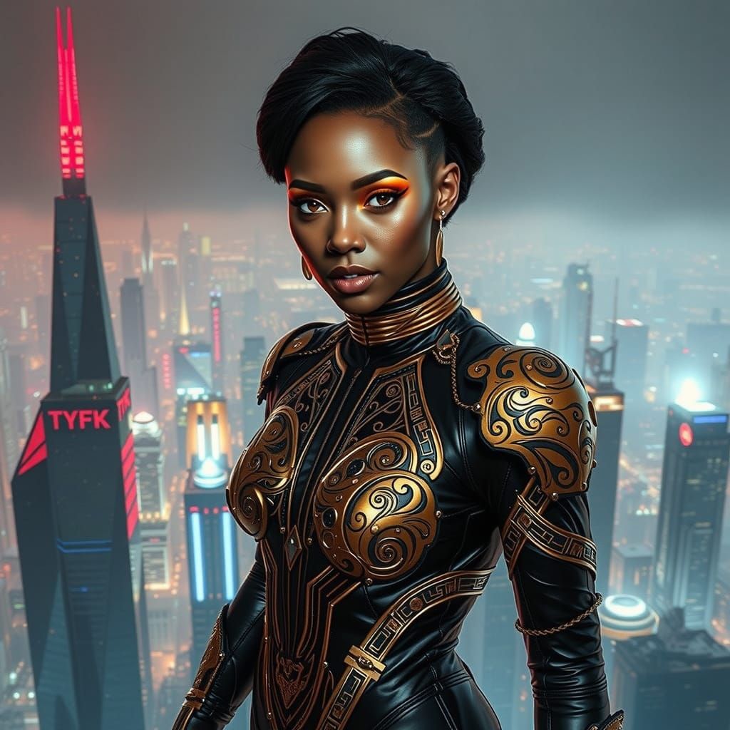 This image showcases a striking ebony woman in metallic gold makeup, standing confidently atop a neon-lit skyscraper, surrounded by a vibrant cyberpunk cityscape with intricate golden filigree adorning her luxurious leather catsuit, evoking a sense of grandeur and otherworldliness