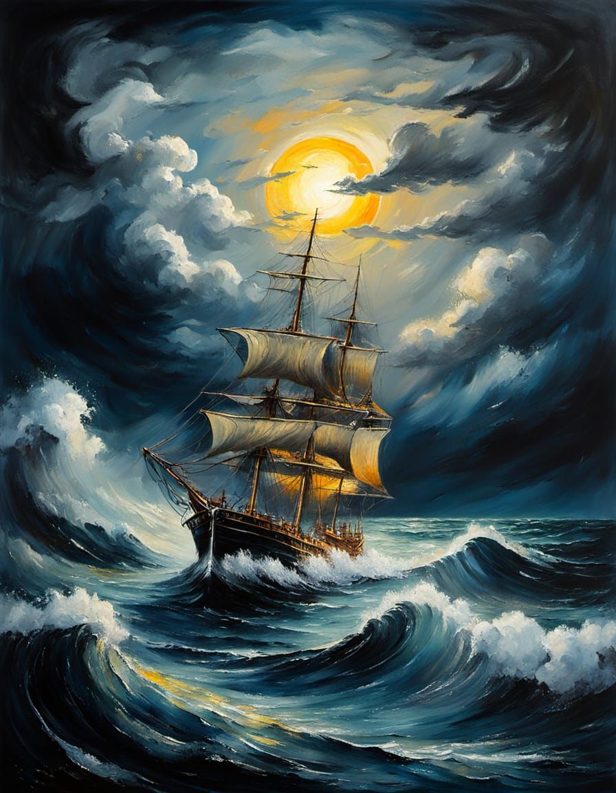 A dramatic seascape painting of a ship navigating high waves under a full moon. The artwork features expressive brushstrokes, vibrant textures, and a warm color palette reminiscent of impasto art.