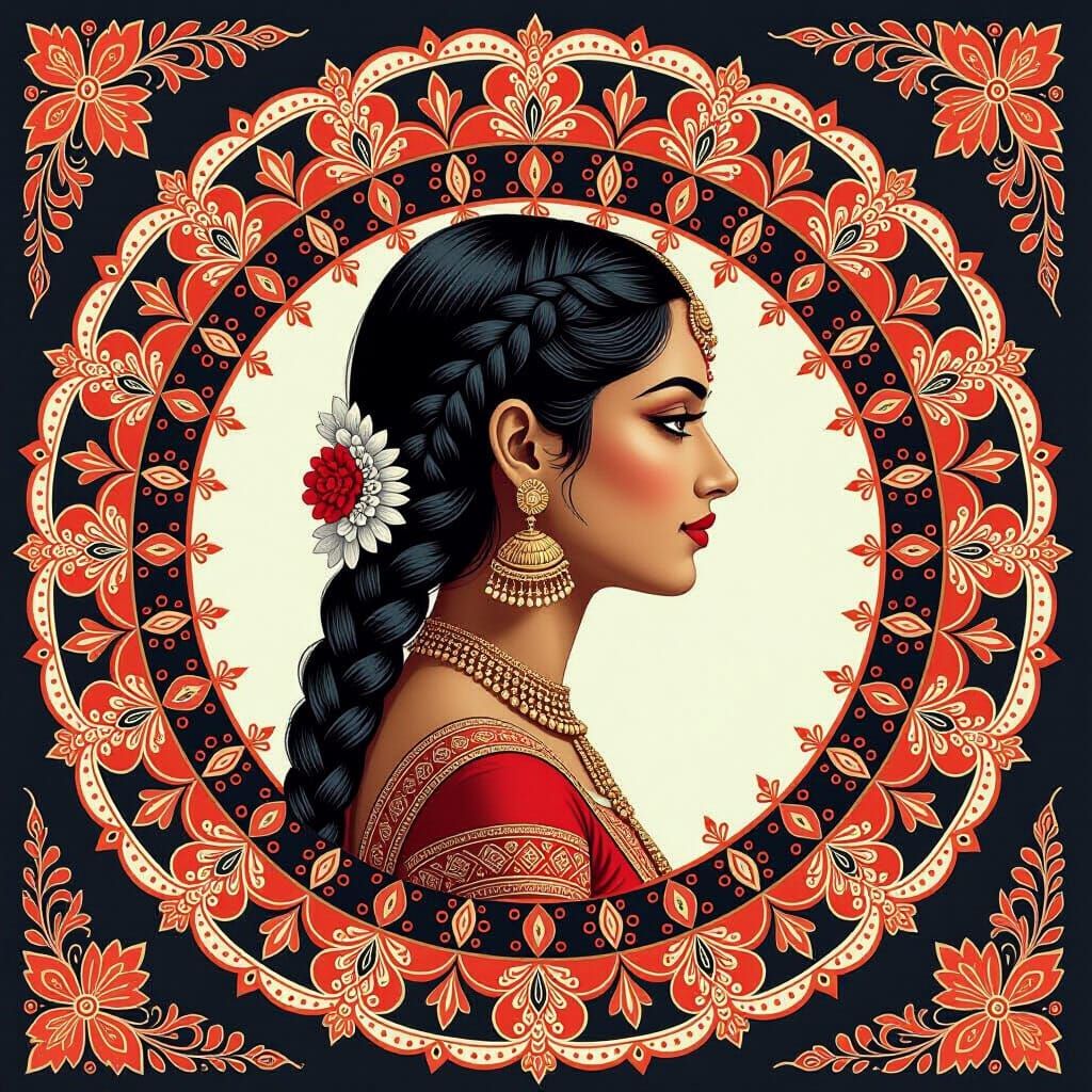 A striking picture of a modern Indian woman with braided hair and brass earrings. The woman emerges from a Pattachitra mandala in vermilion, black, and white, in a folkloric style.