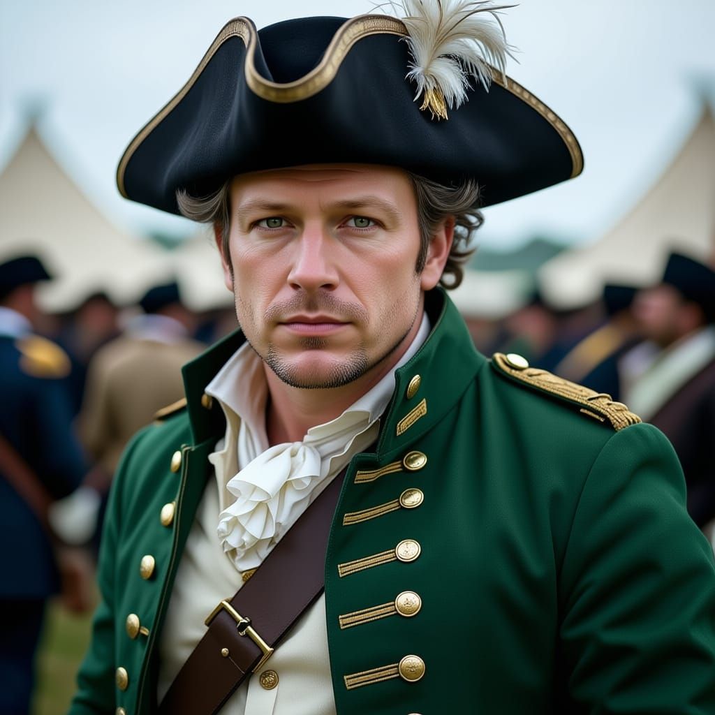A striking close-up portrait of a French aristocrat with intense green eyes, dressed as a corsair in a green coat and white trousers. He stands in an army camp under studio lighting.