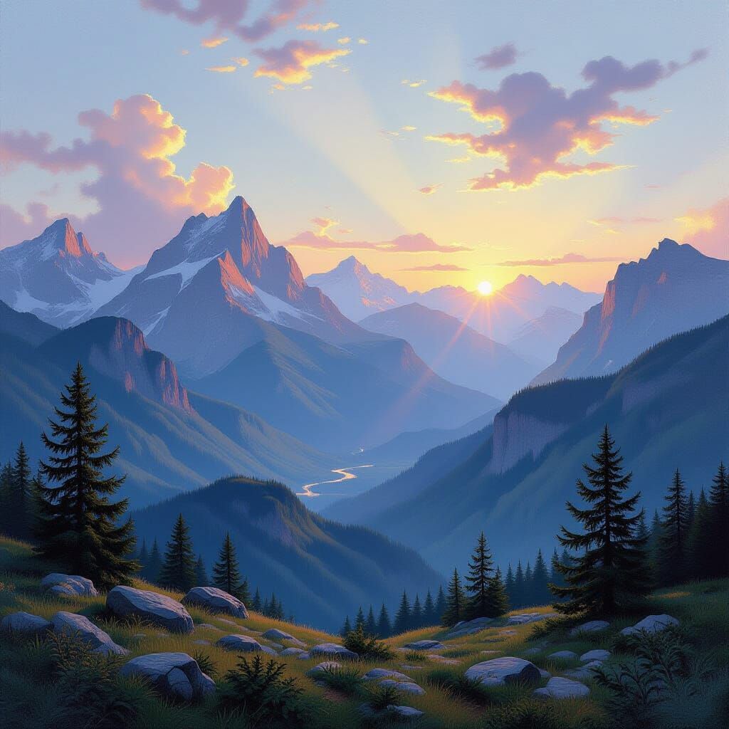 A breathtaking mountain landscape featuring jagged peaks and snow-capped summits. The image evokes the style of 19th-century Romantic painters, emphasizing detailed textures and natural grandeur.