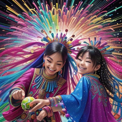 A vibrant digital artwork capturing children joyfully playing with beads. The scene bursts with color as beads explode, accompanied by sparkling confetti, all brightly lit to enhance the playful, high-energy atmosphere.