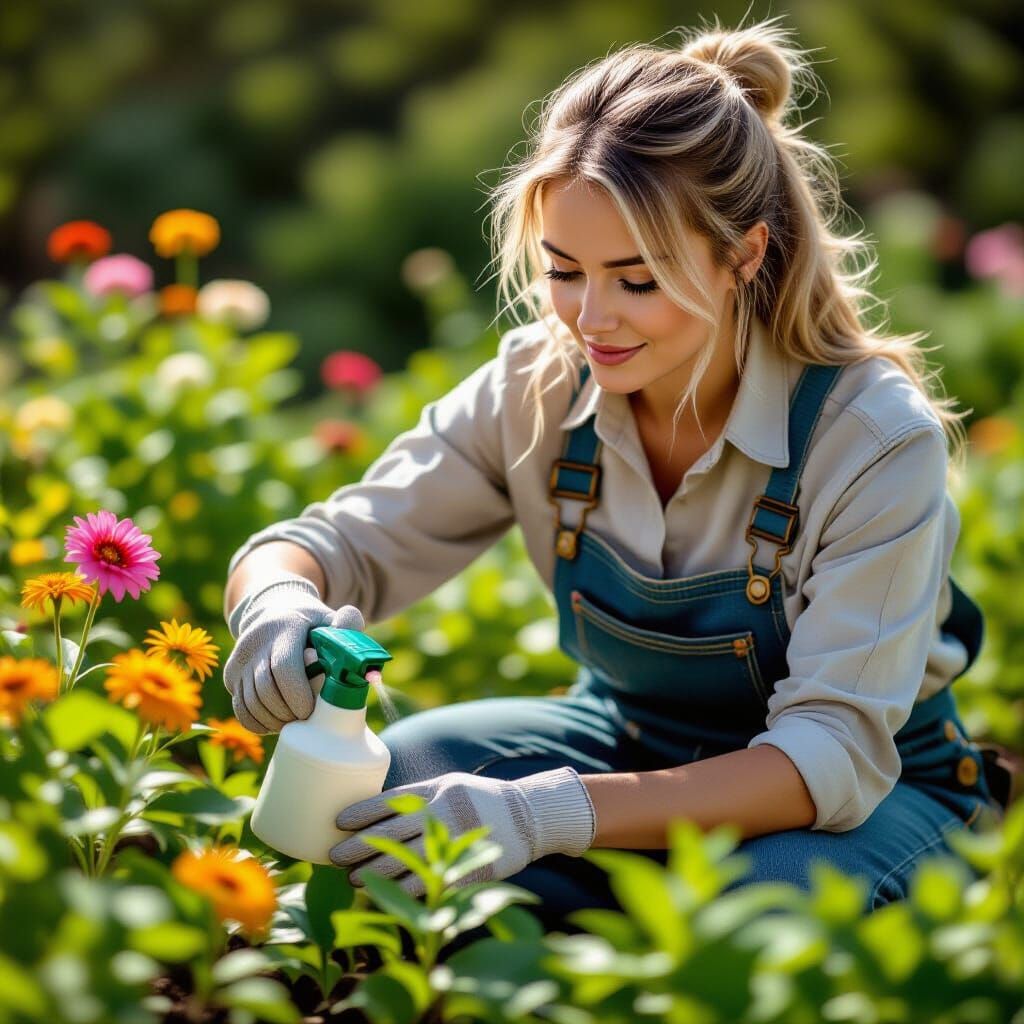 This image shows a beautiful, dirty landscaper woman in overalls gently spraying a flower bed with warm, focused attention. A masterpiece of horticultural care.