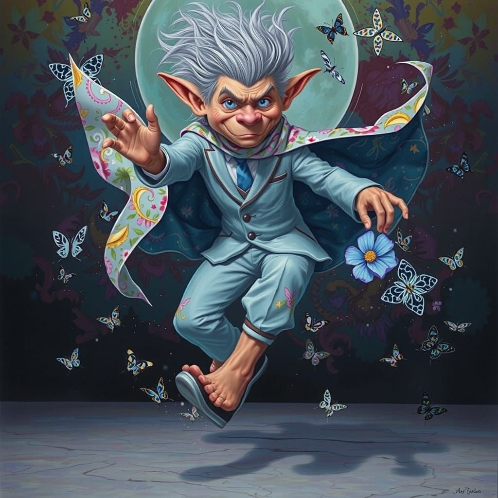 A gorgeous mysterious troll in a power tuck jump , on a marble internet space, big icy steering eyes. his multi piece floral attire as fluid, precise and elegant as a majestic rainbow made of floral patterns and siluetted fairy tales. grey fluffy hair. butterflies. pants, shirt, suit, cape, shocks, ...