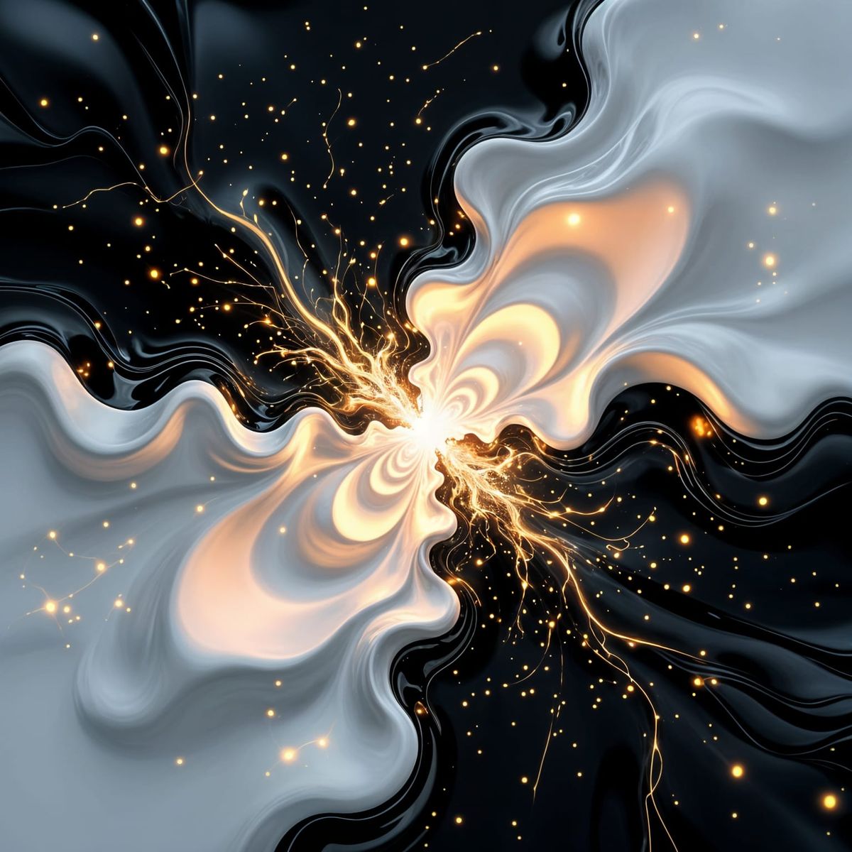 This image showcases a dynamic 3D liquid simulation where white gold light and black oil violently collide, creating turbulent patterns and sparks. Rendered in high contrast with microscopic detail.