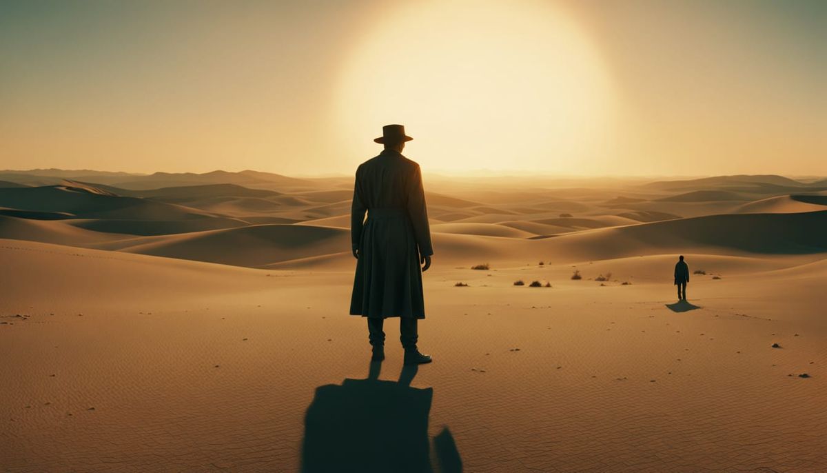 This image shows a lone figure silhouetted in a desolate desert. The scene is rendered in warm tones reminiscent of golden hour, with soft lighting and long shadows in a film noir style.