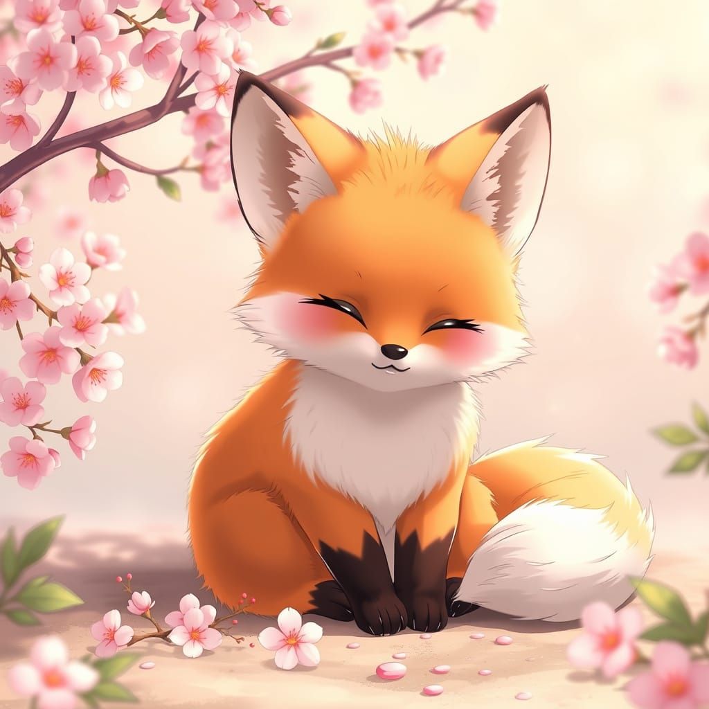 This image shows an adorable fox with soft fur relaxing in a peaceful setting, surrounded by cherry blossoms. Rendered with vibrant colors and delicate lines in a Japanese manga and anime style.