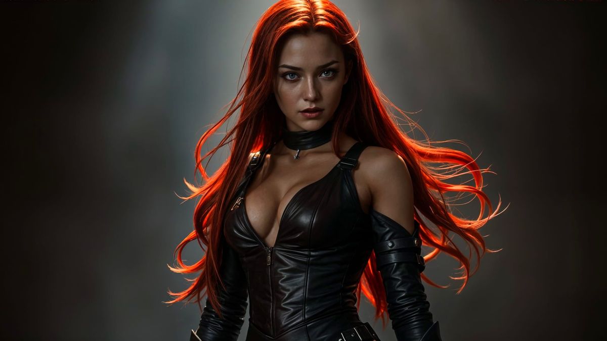 This image shows a hyperrealistic 3D rendering of Rayne from Bloodrayne. Rayne is depicted with red hair and a black and red leather outfit in a cinematic video game style. The image features dynamic lighting and intricate details.