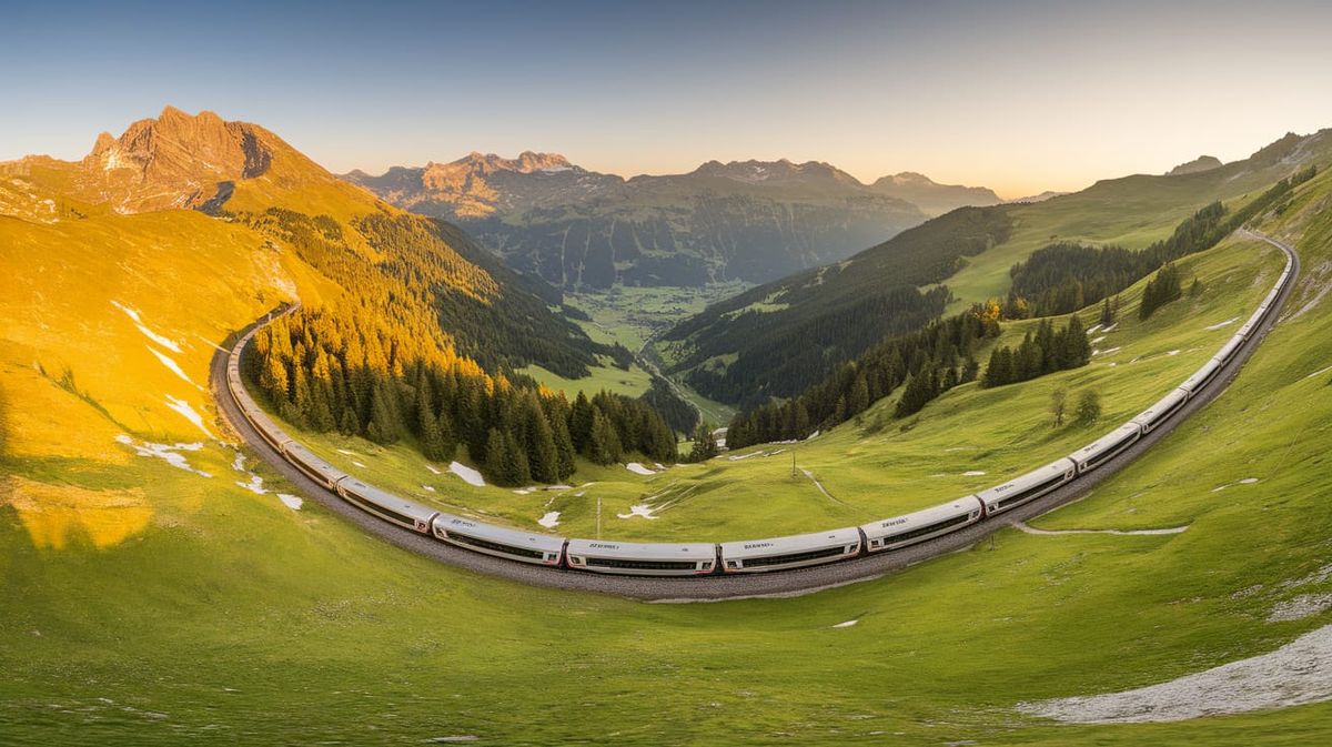 This image shows a serene train journey through the Swiss Alps, with a sleek train winding through valleys surrounded by vibrant green mountains, patches of snow, and pine trees, set against a warm sunset backdrop.