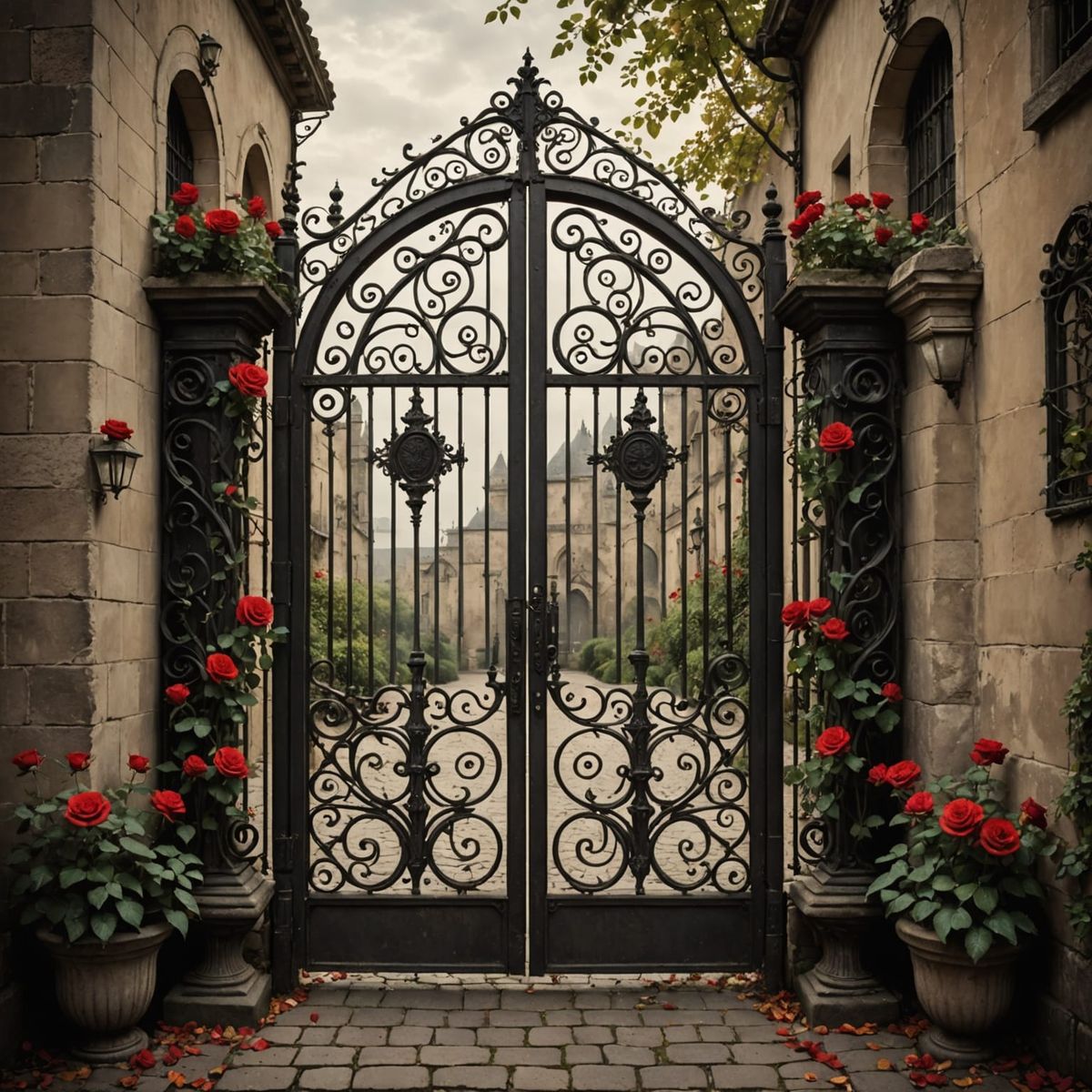 A dark romantic scene featuring ornate iron gates and baroque columns in a gothic setting. The image evokes a dreamy, surreal Victorian garden with a soft, painterly aesthetic.