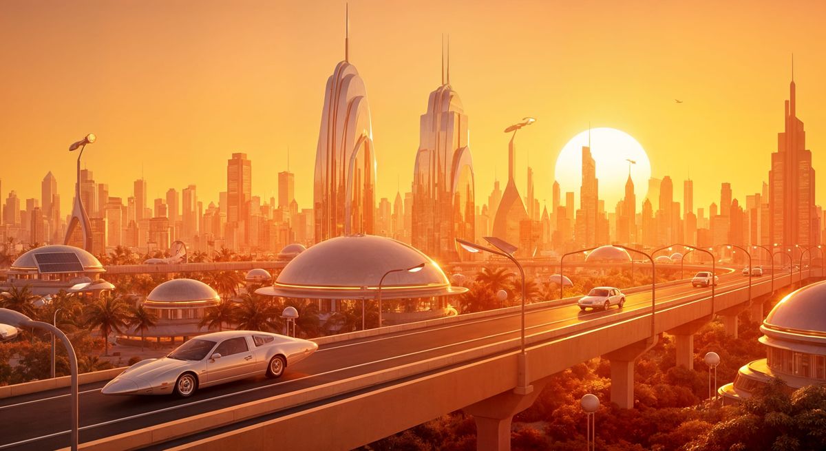 This digital artwork features a serene retro-futuristic cityscape bathed in warm orange light. Experience a nostalgic vision of a utopian city with art-deco skyscrapers and vintage sci-fi vehicles.