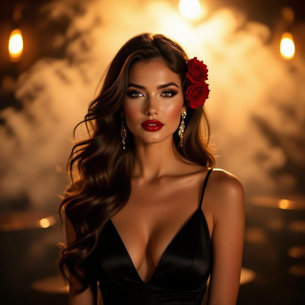A captivating portrait of a woman with rose-adorned hair in a smoky jazz club. The image captures a sense of timeless elegance with warm lighting and film grain, as a vintage analog photograph.