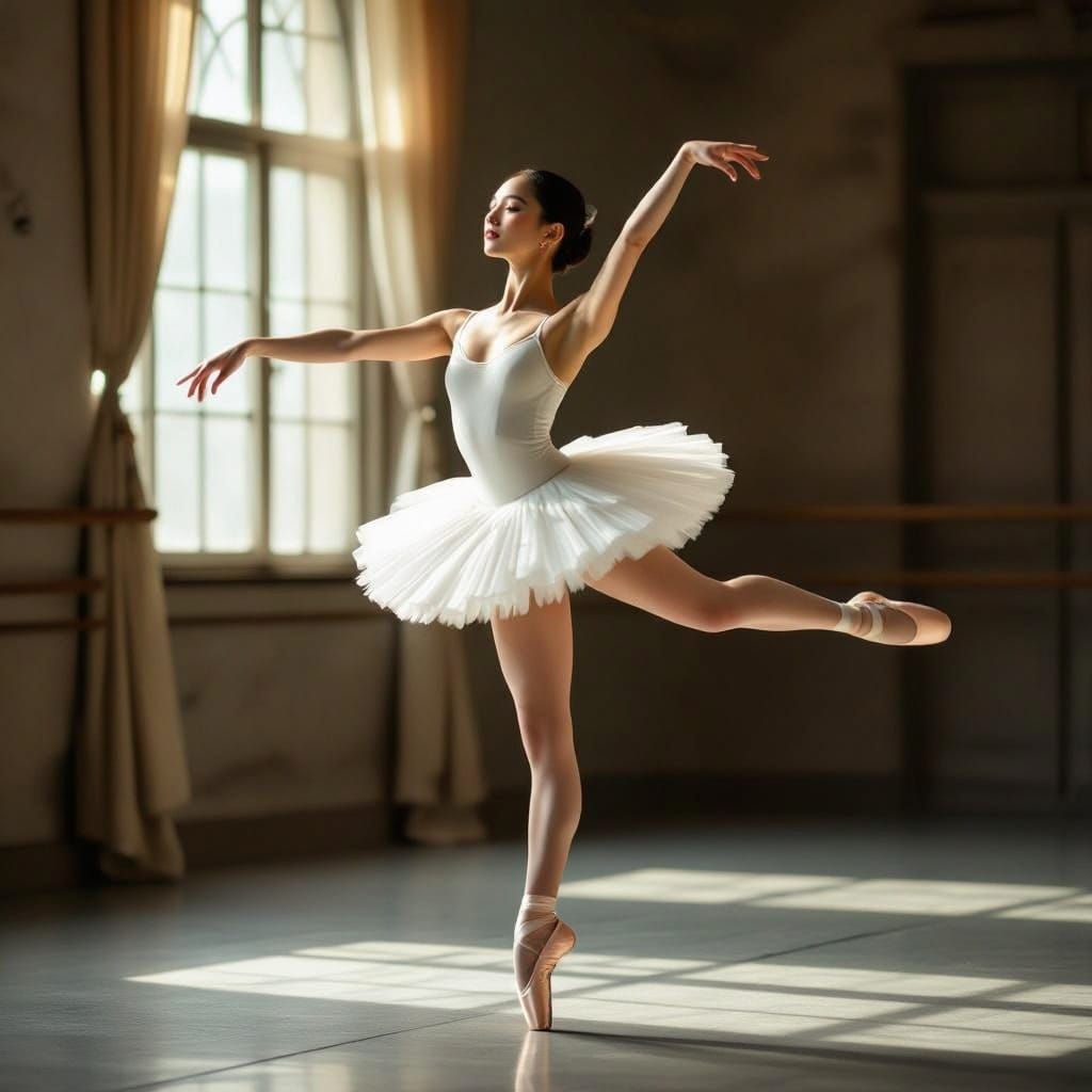 This image captures a serene Asian ballerina in a sun-drenched ballet studio, her delicate features and jade-white skin tone radiating elegance. A romanticized watercolor aesthetic, reminiscent of Alphonse Mucha's style, brings a dreamy quality to her movements, while soft lighting enhances the ethereal ...