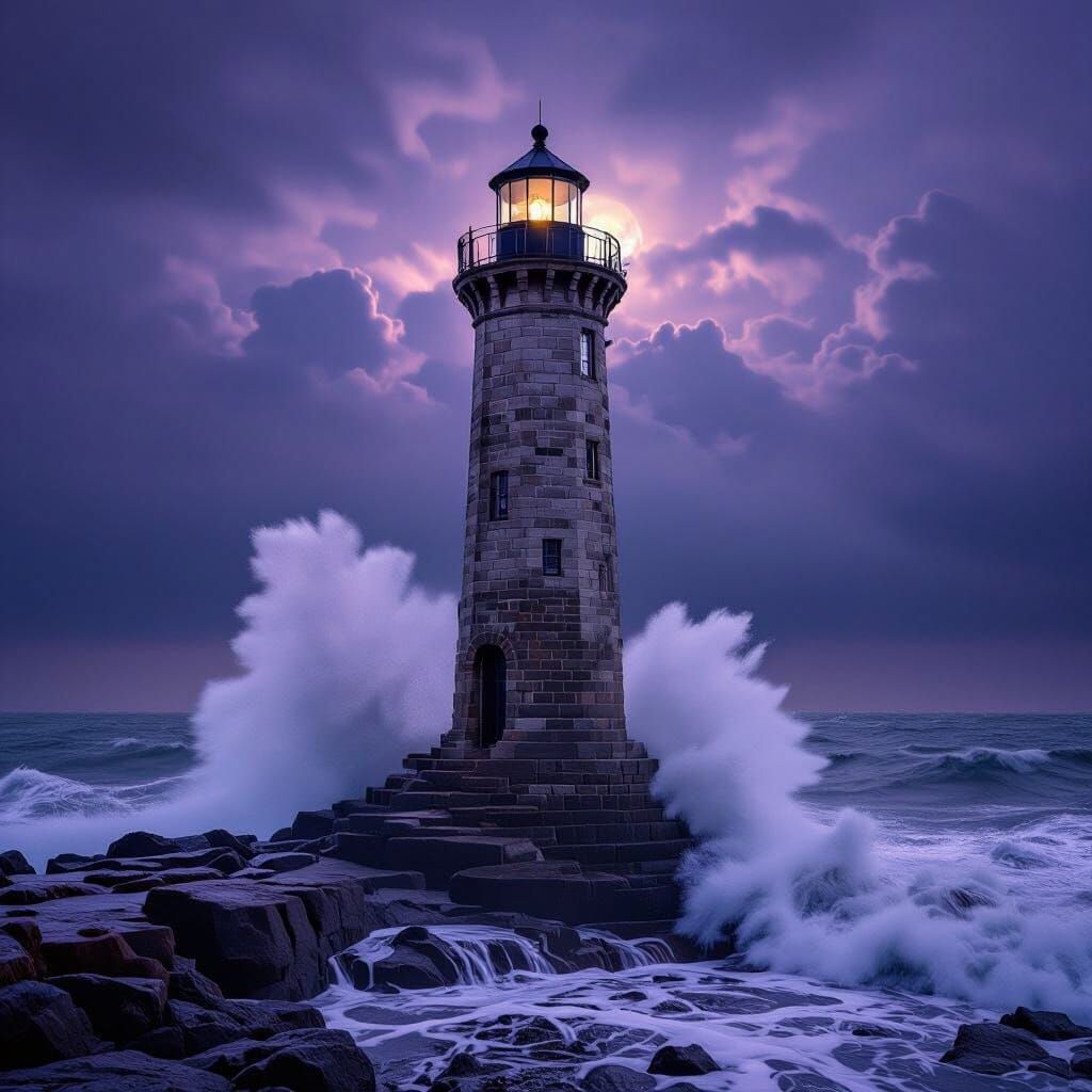 A hyperrealistic image of a lone lighthouse battered by stormy seas under a bruised-purple sky. Dramatic lighting and high contrast create a moody, atmospheric scene.