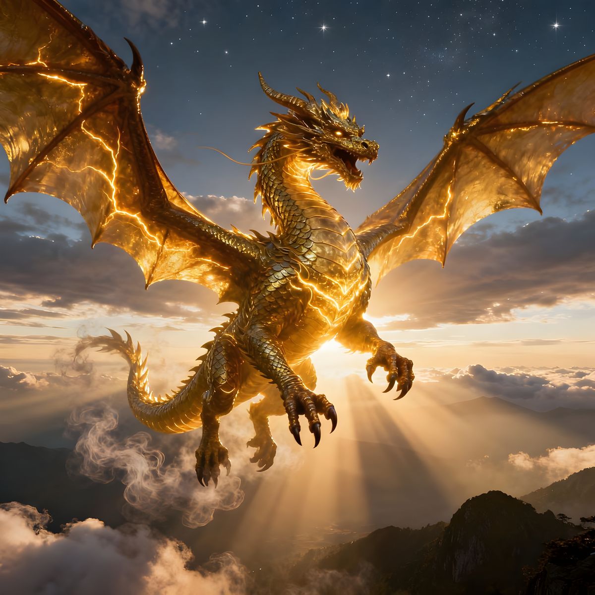 This image features a stunning, ultra-realistic depiction of a shining dragon lighting up the sky from below. The light from the dragon illuminates the entire scene with incredible detail and UDH resolution.