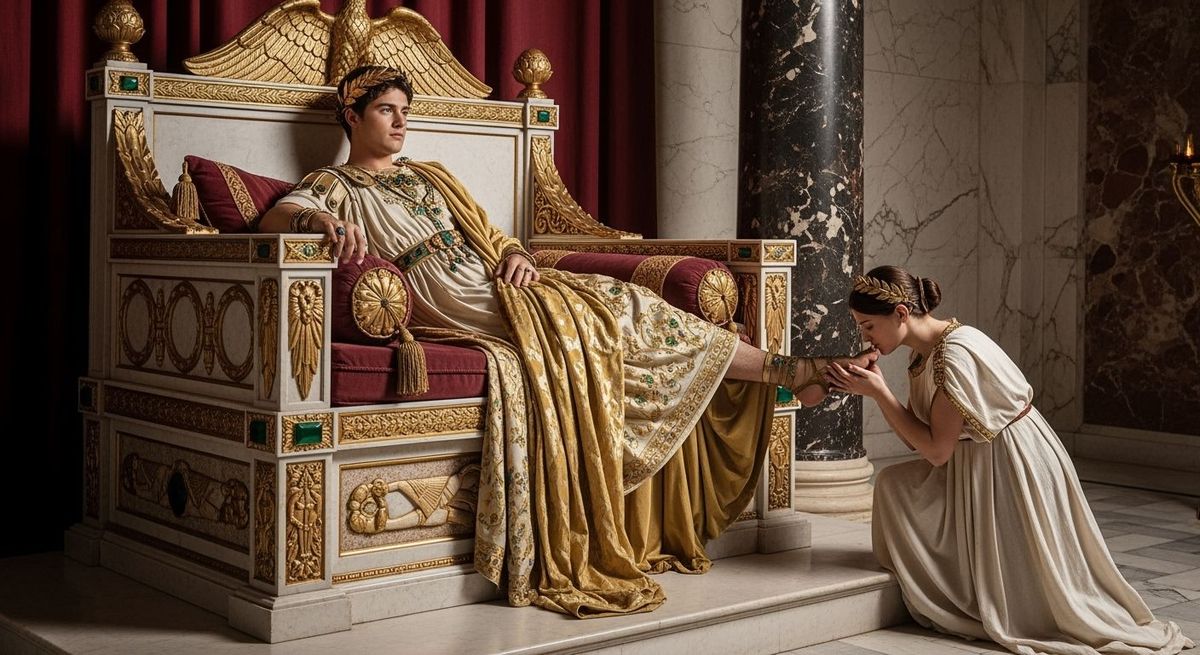 This image depicts Emperor Nero in a lavish Roman throne room. The emperor reclines on a marble, gold, and emerald triclinium while a servant kisses his foot. The scene is captured in a hyperrealistic style.
