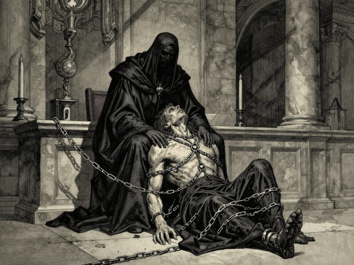 This image depicts a powerful Underworld judge in a grand Netherrealm courtroom. A giant kneels, bound in chains, before the judge. Rendered in a European ink and watercolour style with dramatic lighting.