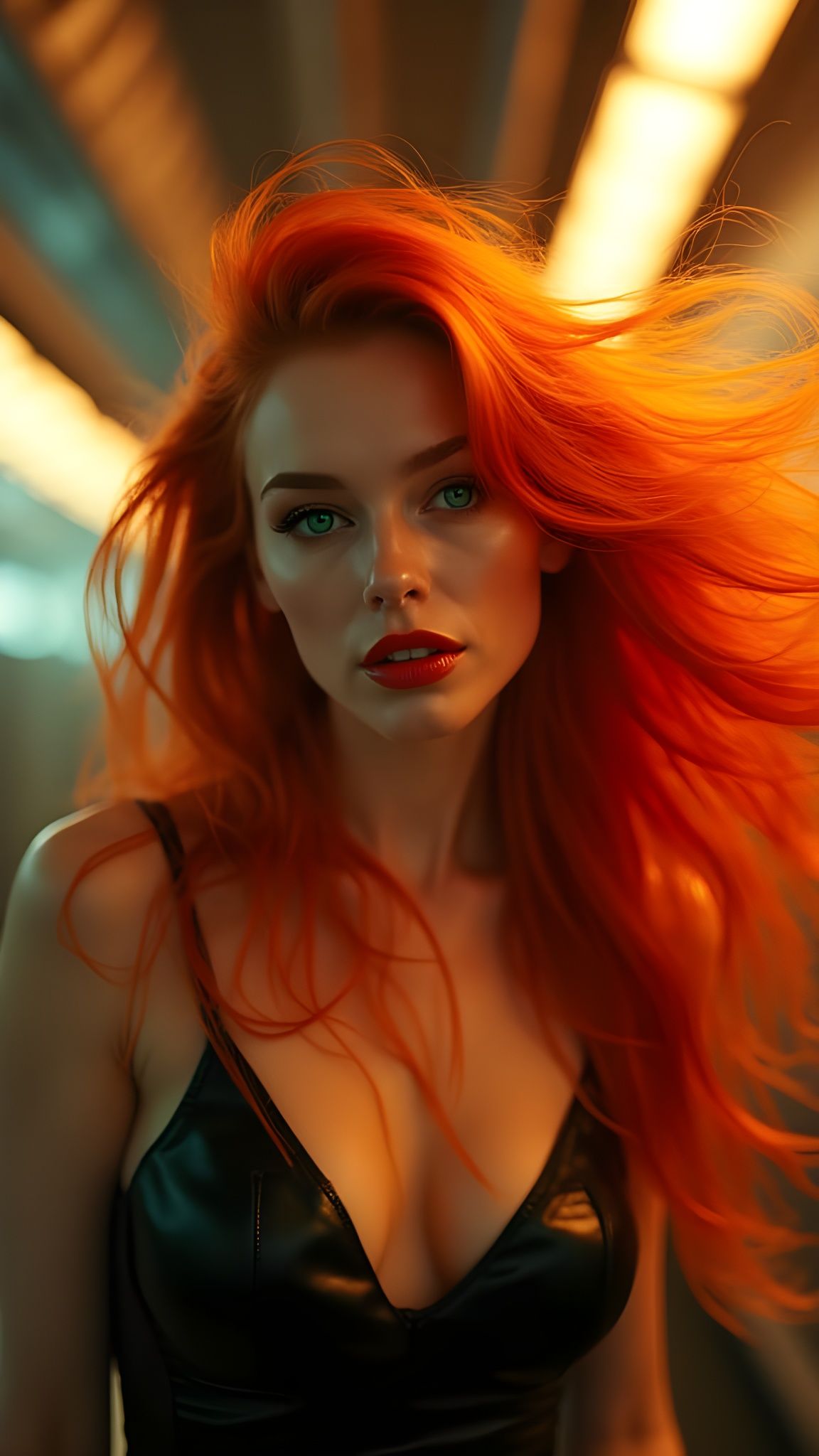 This hyper-realistic image features a striking woman with vibrant red hair against a blurred urban subway background. The close focus and dramatic lighting highlight her intense gaze and alluring expression.