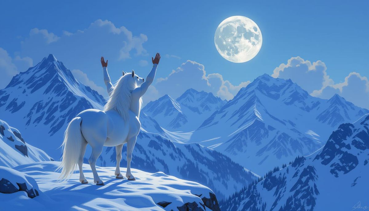 A breathtaking image of a white centaur atop a snowy mountain, gazing at the moon. The scene captures a feeling of serene wonder, with atmospheric lighting and vibrant colors in a romantic style.