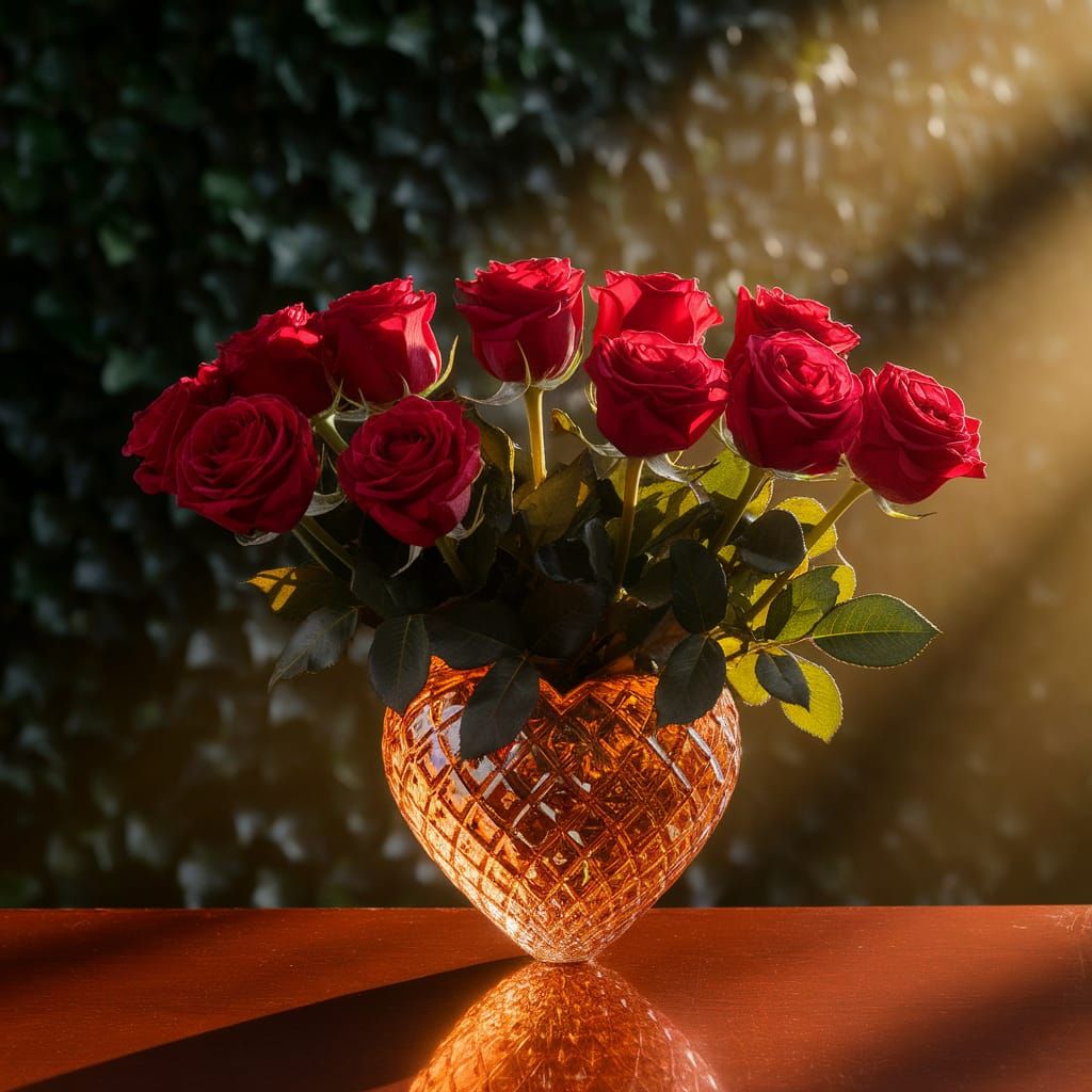 This image features a dozen deep crimson long-stemmed roses in a heart-shaped amber glass vase, illuminated by a sunbeam. The still life composition evokes romantic warmth and timeless beauty, reminiscent of classic floral paintings.