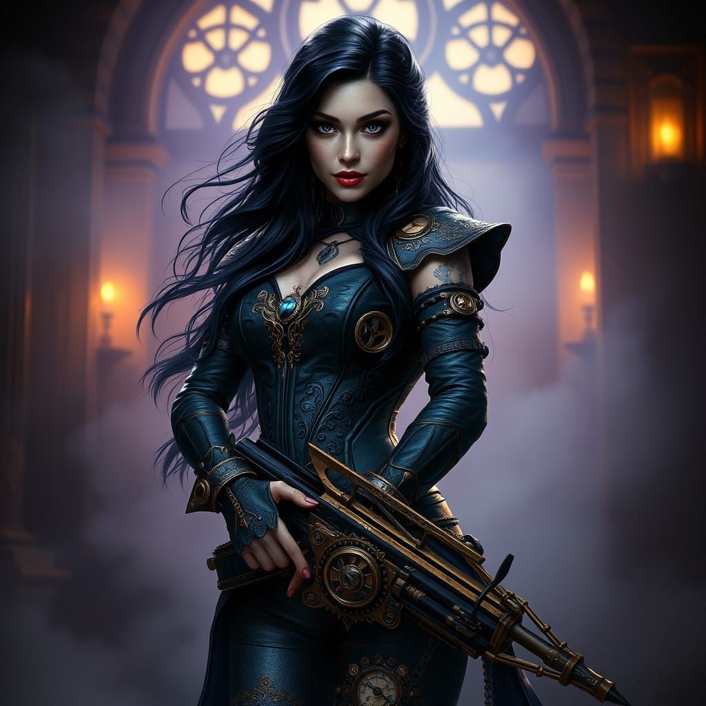 A dramatic, 8k resolution concept art piece featuring a Steampunk artificer in a leather corset, set in a dimly lit, fog-shrouded chamber with intricate clockwork mechanisms and glowing accents. Rich, deep colors and bold contrasts evoke the elegance of Art Nouveau and the gritty industrial feel of steam...