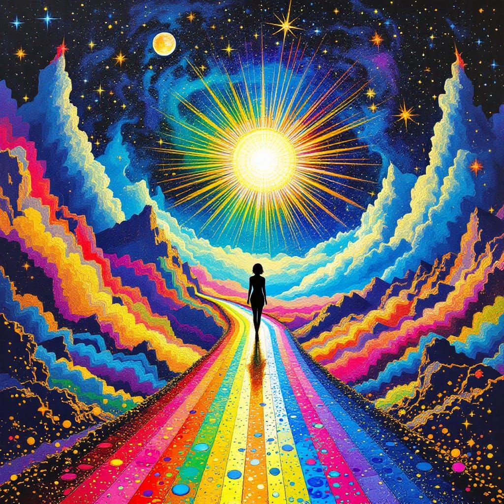 This image blends Byzantine gold-ground technique with Peter Max's vibrant gradients and psychedelic poster art elements, featuring jewel-toned colors, radiating patterns, and gilt highlights.