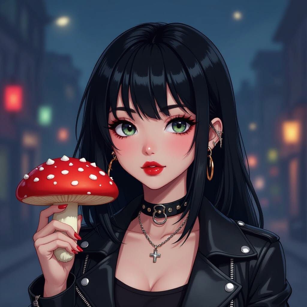 This image shows an anime-style girl with black hair, red lips and a nose piercing, holding a mushroom. She's wearing a black dress and punk leather jacket, in a Takashi Murakami-inspired anime style.