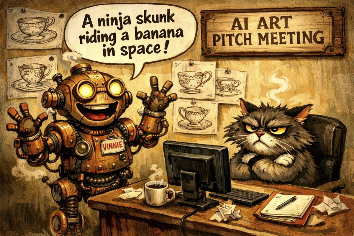 An excited clunky steampunk robot wearing a "Vinnie" name tag is in an office, speaking to a frazzled annoyed grumpy cat sitting at a desk in front of a computer. The robot exclaims "A ninja skunk riding a banana in space!" .There are hand drawn sketches of fancy teacups on the wall. A wall sign stating ...
