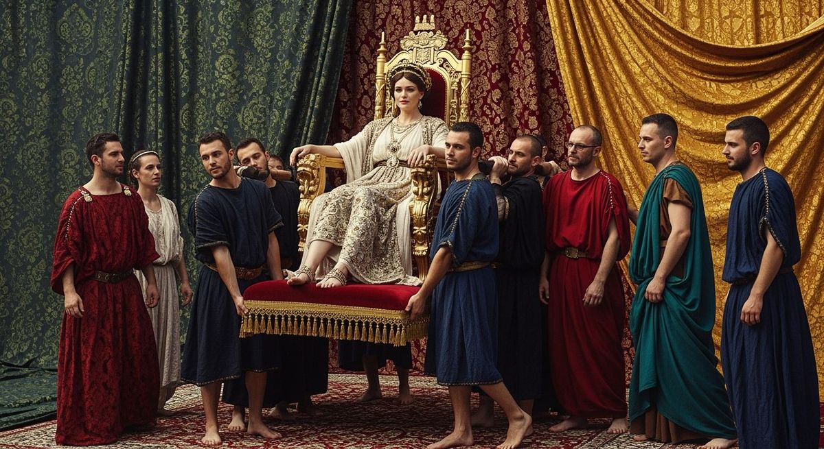 A striking picture of a Roman Empress being carried on a golden throne. Twelve servants bear her as she is adorned in opulent fabrics, captured with soft, natural lighting and shallow depth of field.