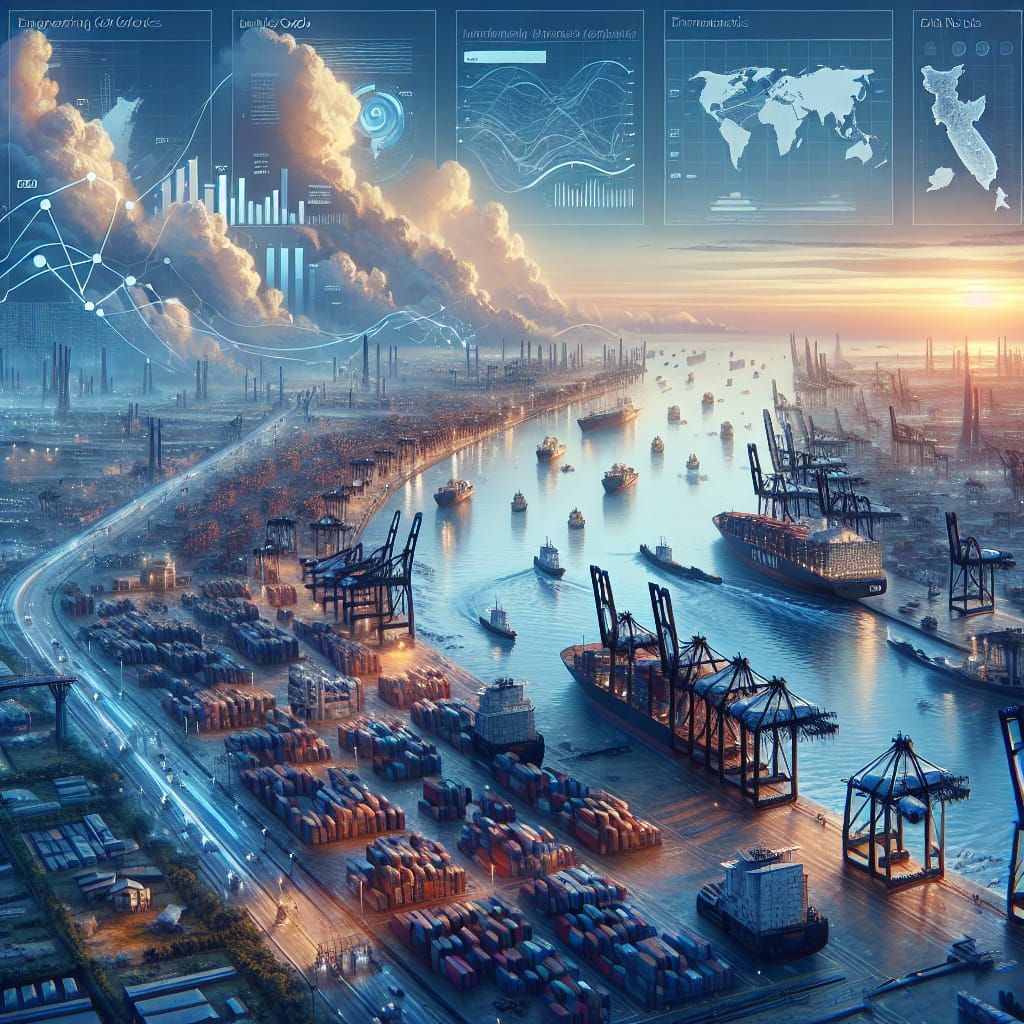 This image showcases a bustling port scene at dawn, featuring ships, containers, and factories. Infographic elements and global trade routes are integrated, rendered in a fantasy concept art style with complementary colors and matte finishes.