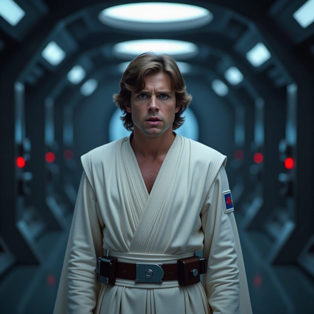 A cinematic image shows Luke Skywalker in white robes looking shocked in a dimly lit Rebel base corridor. The artwork features a moody, slightly surreal aesthetic.