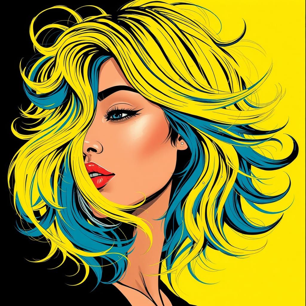 A woman's hair features a mesmerizing blend of yellow and blue hues in wavy patterns, evoking urban grittiness and nostalgic tones, with subtle iconography and bold, contrasting colors.