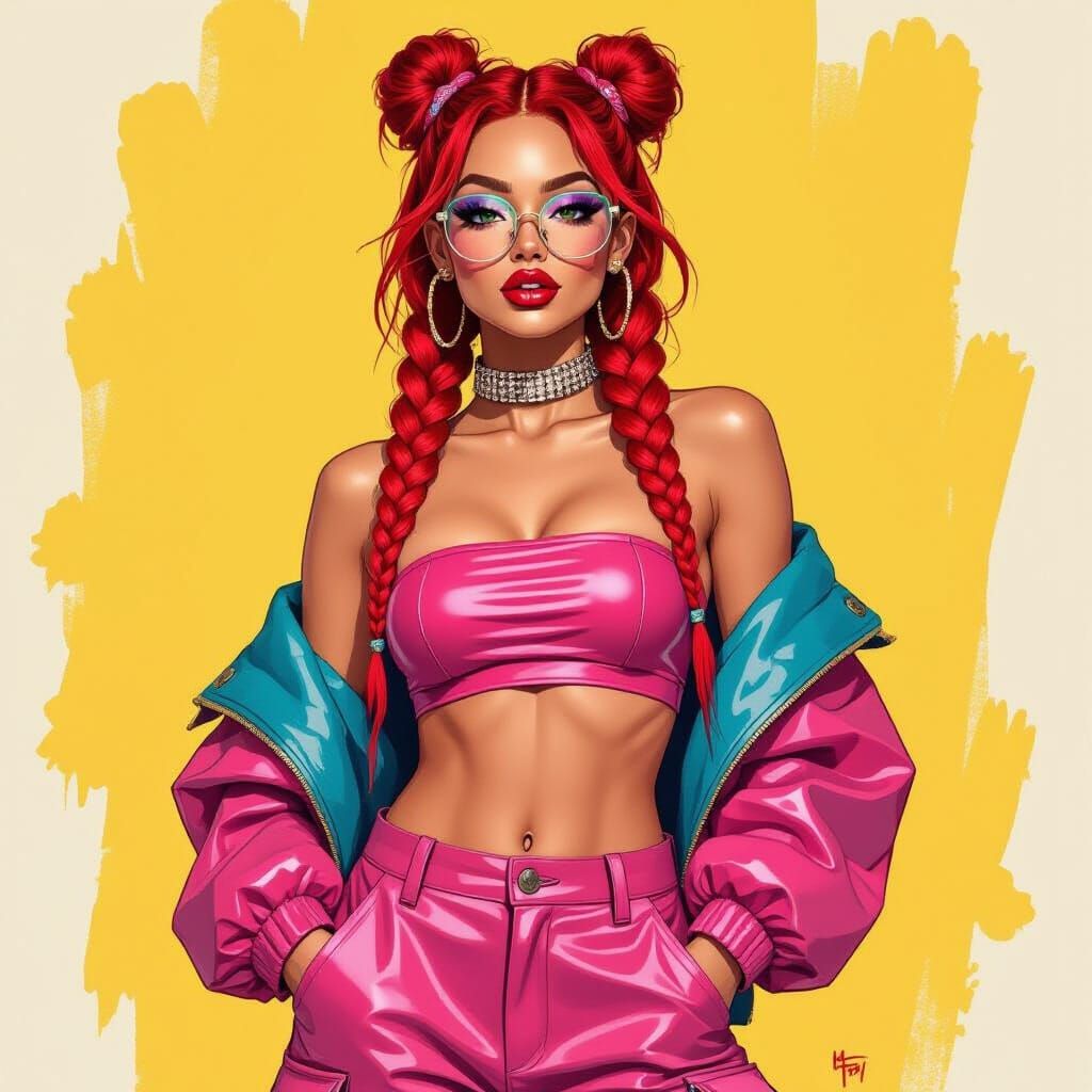 A vibrant mixed-media portrait of a sassy woman with red hair and braids, wearing a metallic pink and blue outfit. The artwork blends oil sketch, illustration, and encaustic techniques with charcoal lines.