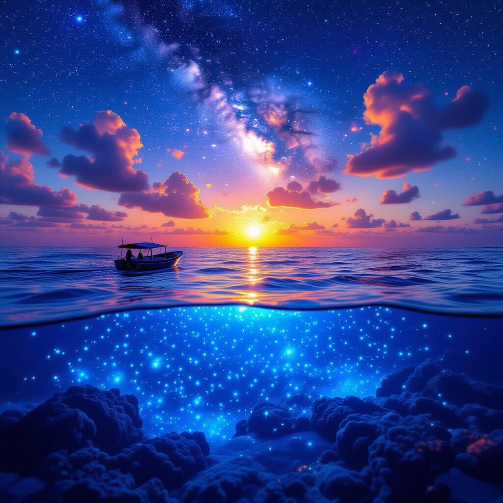 Imagine the Sea of Stars in the Maldives on a particularly beautiful night where the sun setting casting off colors into the sky with the bl...