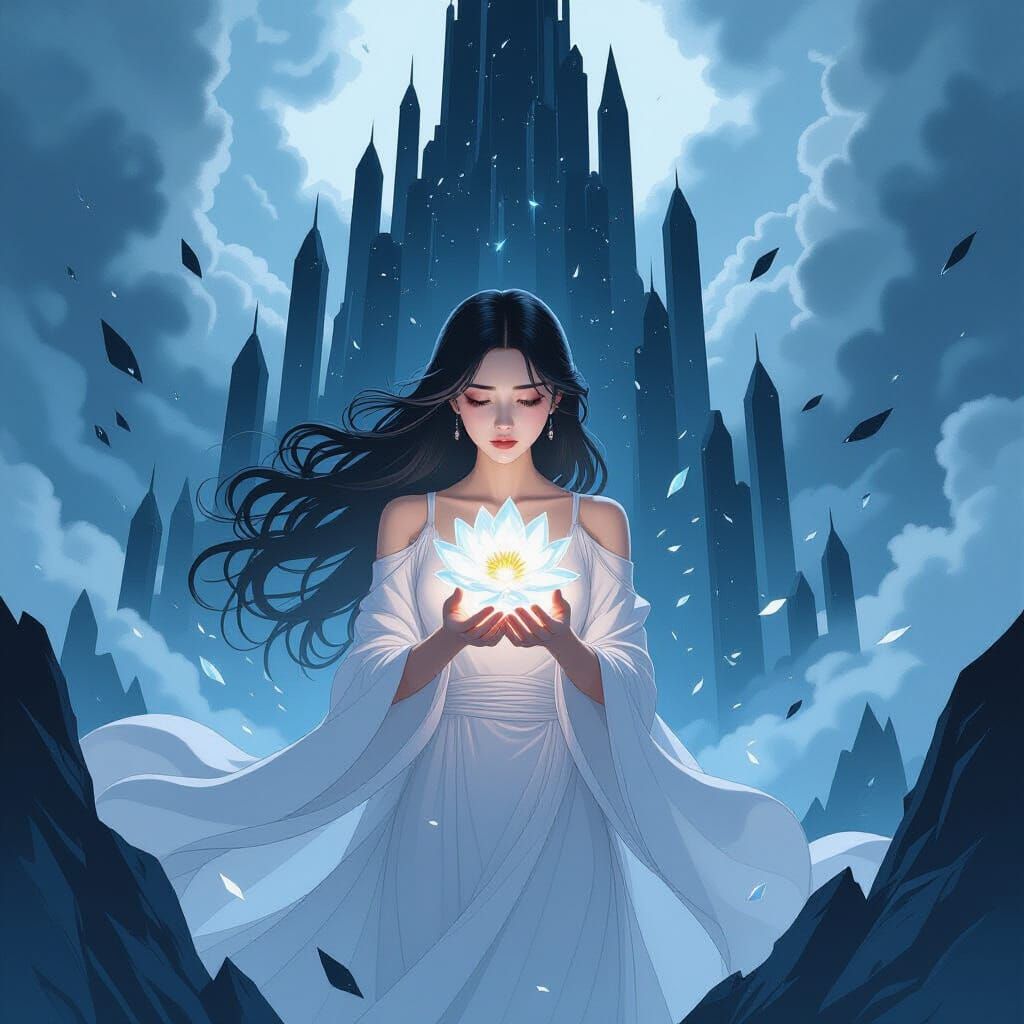 This image shows a Korean woman in a flowing dress, her face expressing pain as she holds a glowing crystal blossom. A black crystal fortress looms in the background in a dreamlike watercolor style.