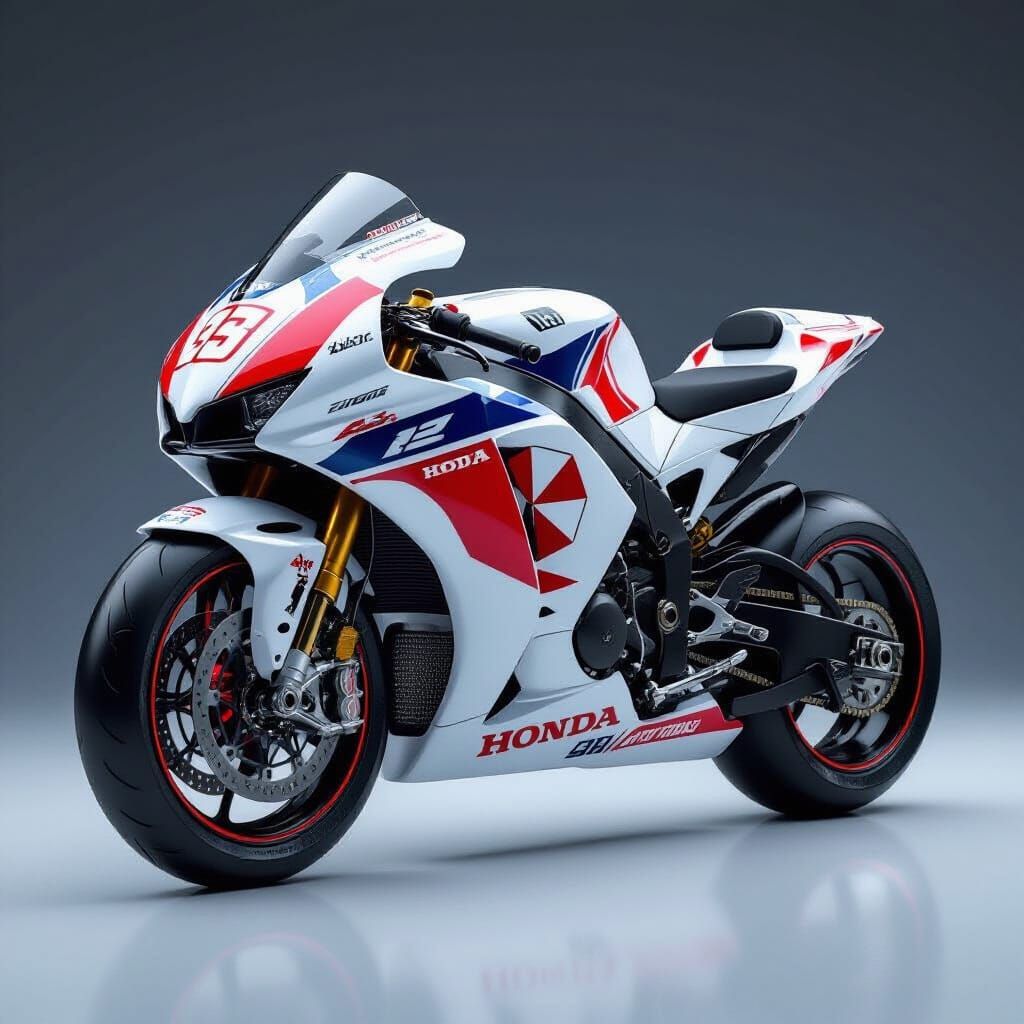 This image shows a high-performance Honda MotoGP motorcycle in a dynamic pose, featuring the iconic white and red Umbrella Corporation livery with sharp metallic textures and studio lighting.