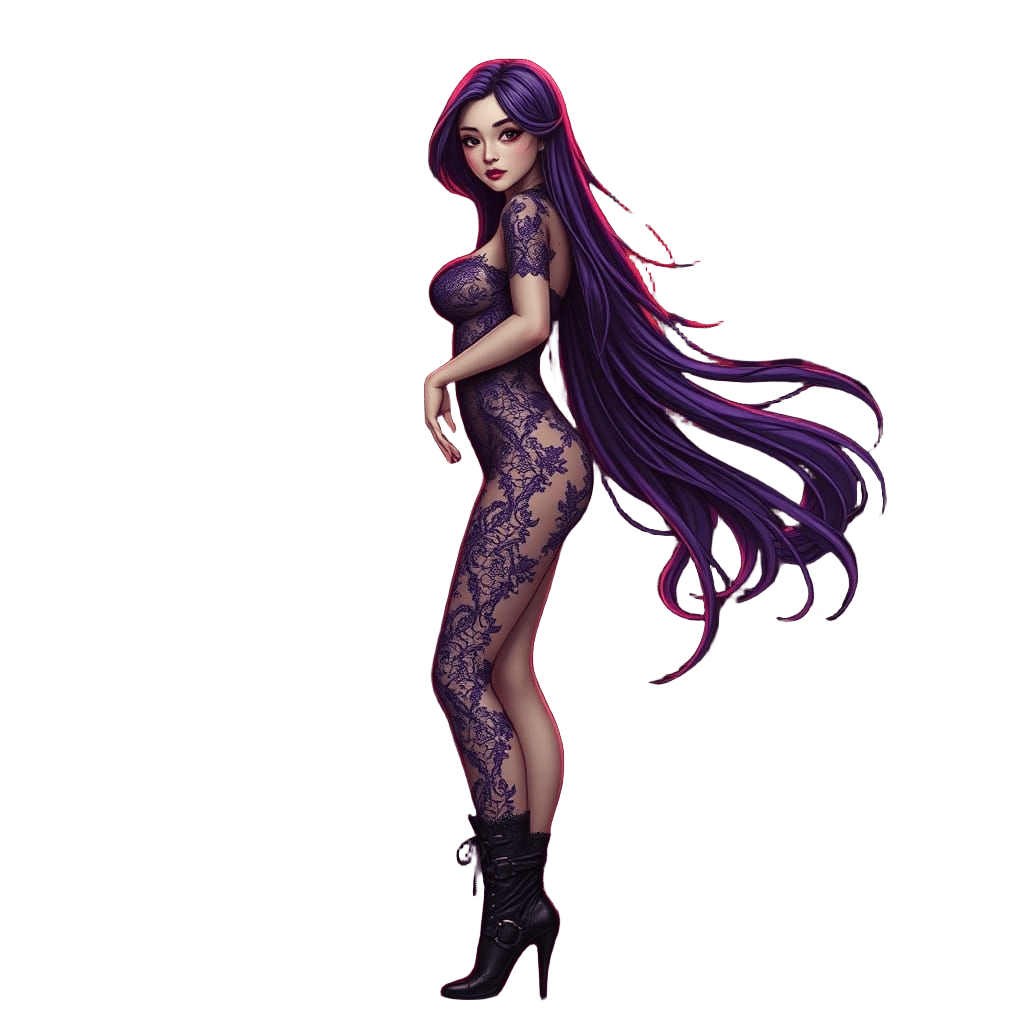 This image features a slender Asian woman with porcelain skin, standing tall in a dark, foreboding wood, illuminated by a red backlight. She wears a lavish purple lace outfit, accentuating her curvaceous figure, with long, flowing purple hair and high heel boots. The atmosphere is dark, sensual, and myst...