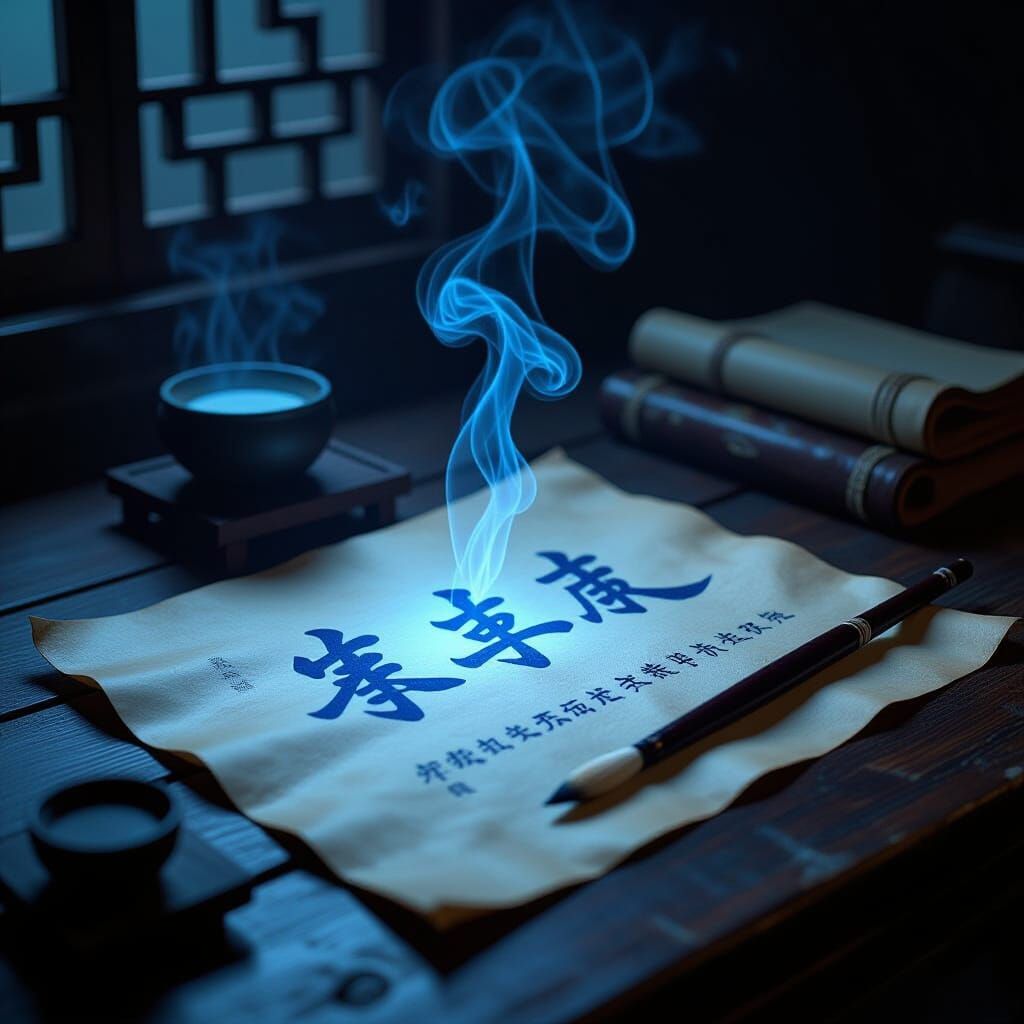 This image shows ancient Chinese calligraphy glowing blue on old rice paper, beside an inkstone and brush. Faint incense smoke rises in a dark, serene study, evoking tradition.