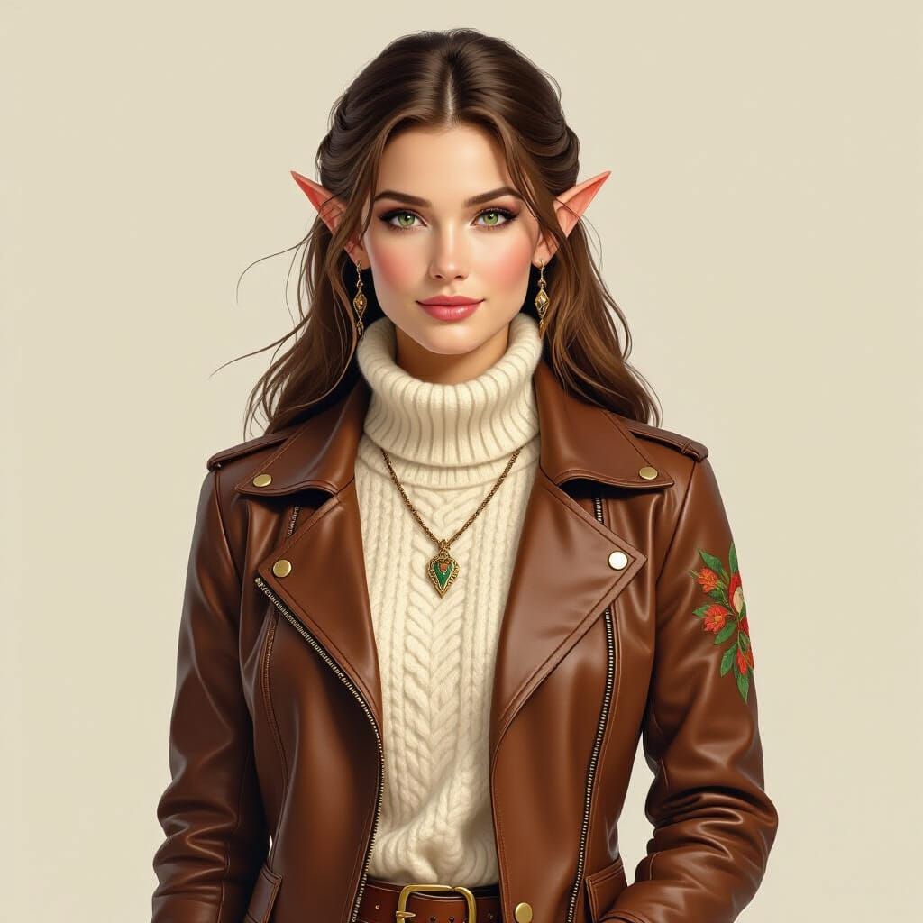 A striking image of an elf woman in a leather jacket and wool jumper. The artwork evokes fantasy art with intricate details and earthy colors.
