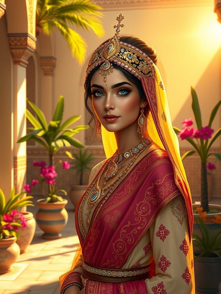 This image shows a regal Arabian princess in traditional attire, set against a courtyard with geometric patterns and vibrant plants. It features golden hour lighting and a detailed digital painting style.