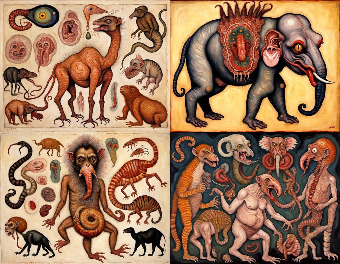 This image depicts a surreal and unsettling scene featuring a bizarre collection of mythical creatures and internal organs, rendered in the style of an Egon Schiele oil painting with elements reminiscent of James Ensor and Pirosmani.