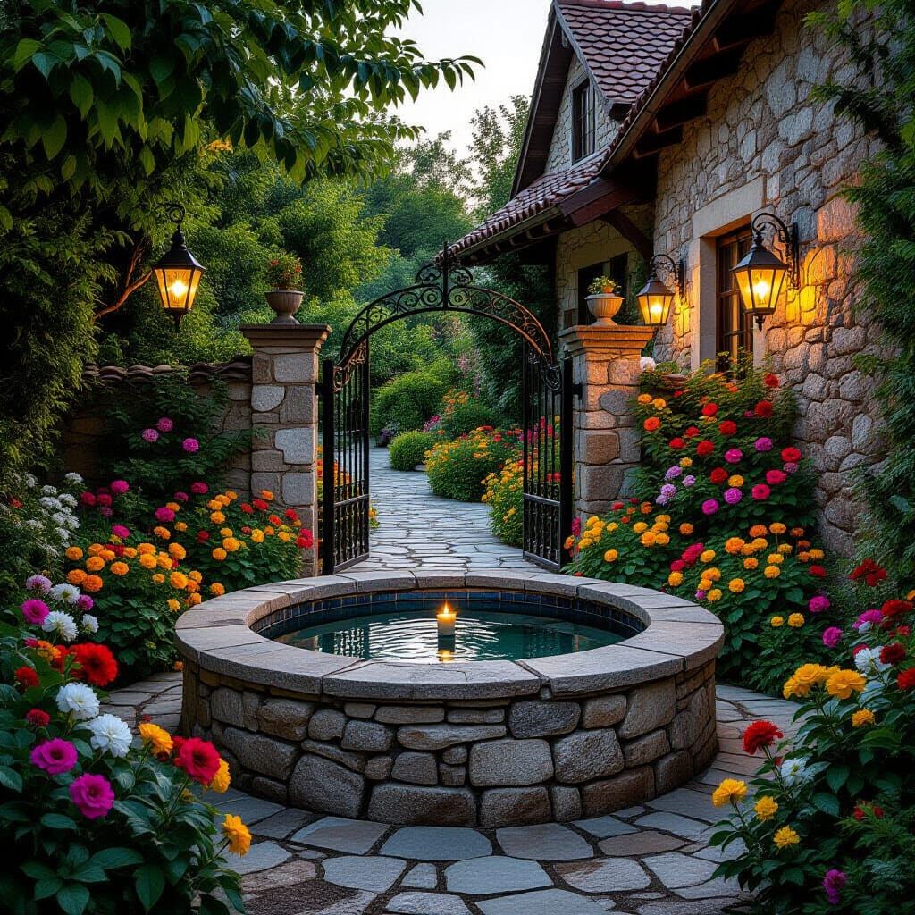 This photorealistic image shows a stone well with clear water, a vintage house, and a vibrant flower garden. Warm light from lanterns illuminates the ornate gate and wall, captured with cinematic detail.
