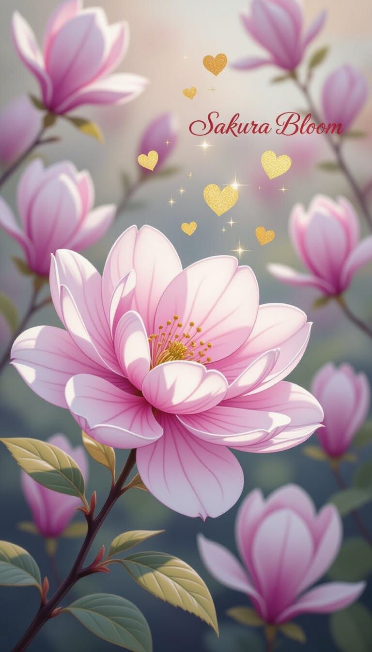 A realistic colored pencil illustration of a single Sakura blossom with gold hearts floating above. Inspired by Monet's nature scenes and Van Gogh's textures.