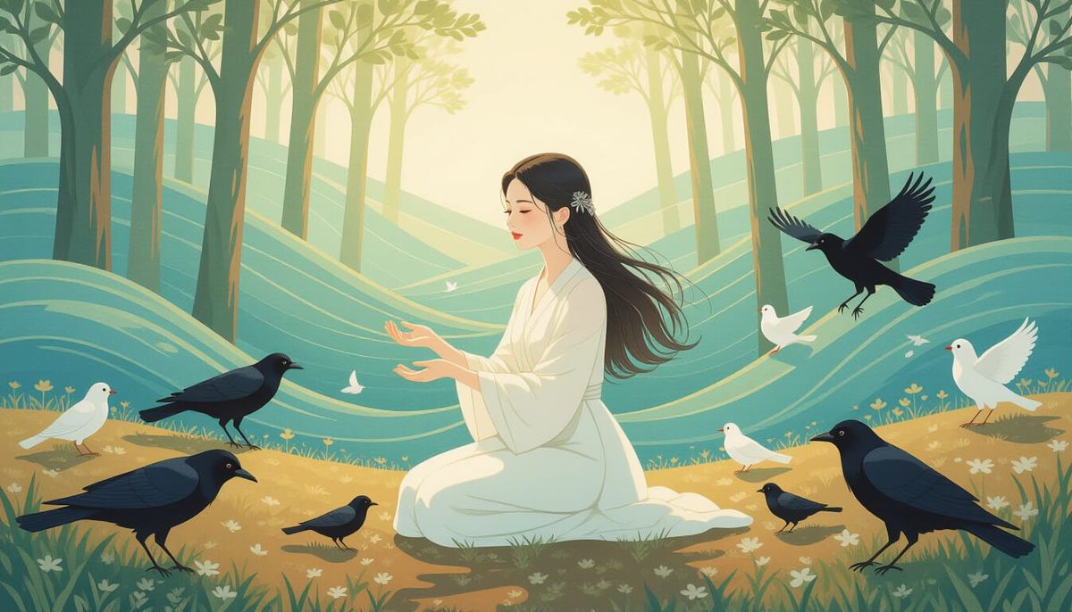 A surreal landscape in the style of Mulgil Kim depicting a woman kneeling in nature surrounded by crows and white birds. The artwork evokes a dreamlike atmosphere with intricate textures.